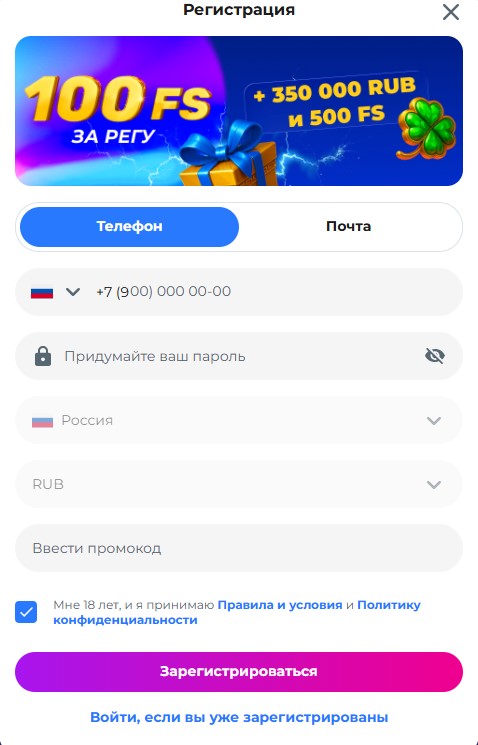 - Подтвердить совершеннолетие и согласие с правилами, затем завершить регистрацию кодом из SMS или ссылкой из письма