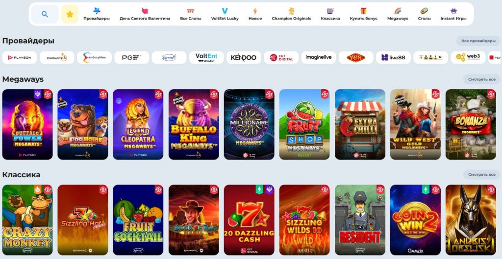 В каталоге Champion casino более 4000 игр — хватит надолго даже тем, кто играет каждый день. Контент разбит по чётким категориям, поиск нужного занимает секунды.